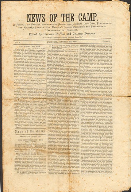 Original copy of the newspaper published in the beleaguered city of Pretoria, in which the main item of news is a resume of the hostilities to date, including an engagement at Zwarte Kops. The plant, type, printing presses etc, of the Transvaal Argus\' had been brought into camp when the evacuation of the town of Pretoria was decided upon, and the paper was printed on this. After the siege was lifted, some 200 copies were specially bound as souvenirs - but there are few single sheets extant. Some sporadic foxing and tears into margins, otherwise good condition