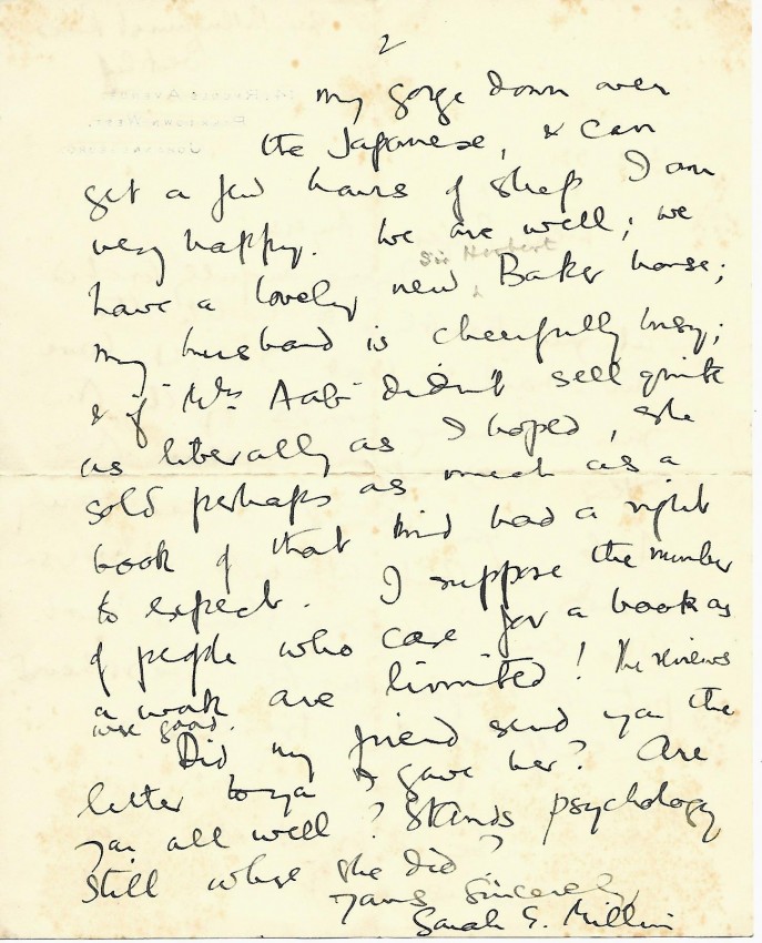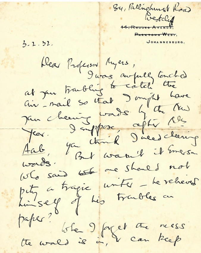A most interesting 2pp. autograph letter (circa 200 words) to Professor Myers, dated 3.2.32 on her addressed letterhead with the address altered in Millin's hand to read "34 Pallinghurst Rd, Westliff". She thanks the recipient for his kind words "I suppose, after Mrs. Aab, you think I need cheering words. But wasn't it Emerson who said one should not pity a tragic writer - he relieves his troubles on paper?................& if Mrs Aab didn't sell quite as liberally as I hoped, she sold perhaps as much as a book of that kind has a right to expect." (Referring to Millin's novel, The Sons of Mrs. Aab, published in 1931). She also refers to her lovely new Baker house. (Sir Herbert Baker, prominent architect in South Africa). With some comments on "the mess the world is in" and a mention of her problem of insomnia. On a single leaf with slight foxing but still about very good.
