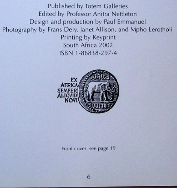 This is an exhibition catalogue for the show hosted by the Standard Bank Gallery and curated with the University of the Witwatersrand.