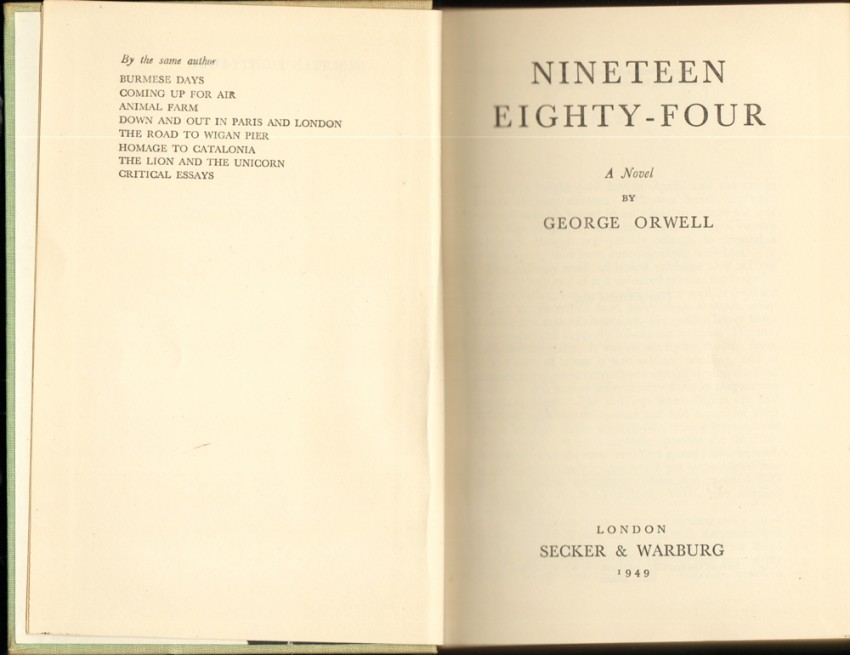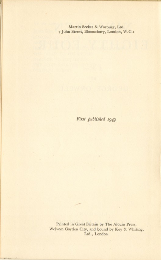 Fenwick (Gillian) George Orwell, a Bibliography, St Paul’s Bibliographies, 1998, A.12a (pages131/132), 'Published 8 June 1949. 10s 9d, 25,575 copies printed. By the end of 1949, 22,700 copies sold. There is another state of the first issue with a green jacket.'