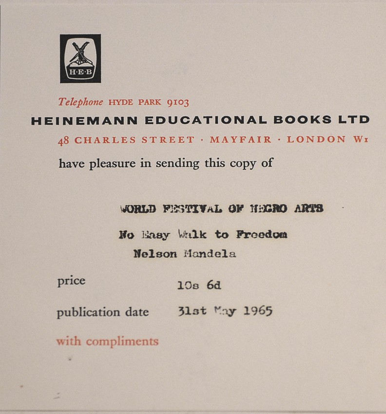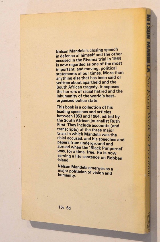 The first edition of this book, Mandela's first title, was published while he was imprisoned on Robben Island and was, for obvious reasons, banned in South Africa. It was simultaneously published in both hardcover and softcover editions. They are both scarce - in my experience, this softcover ediiton in wrappers is possibly even scarcer than the hardcover edition - definitely so in collectable condition. The copy on offer is a Review Copy with the publishers slip loosely inserted. The publication date is indicated as 31st. May 1965.