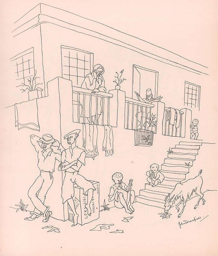 He and his partner, the arts critic and author Denis Hatfield, kept a kind of open house for artists and worked closely together in the 1940s, particularly on his publications. His published art work and poetry include: Non-Europeans Only : Thirty-six Drawings by John Dronsfield in 1942 The Work of John Dronsfield edited by Denis Hatfield (Johannesburg: SA Architectural Record, 1944); and posthumously, Satires and Verses by John Dronsfield, edited by Denis Hatfield Bullough (Oxford/New York: Oxford University Press, 1955) and two portfolios of reproductions of his graphic studies, entitled African Improvisations.