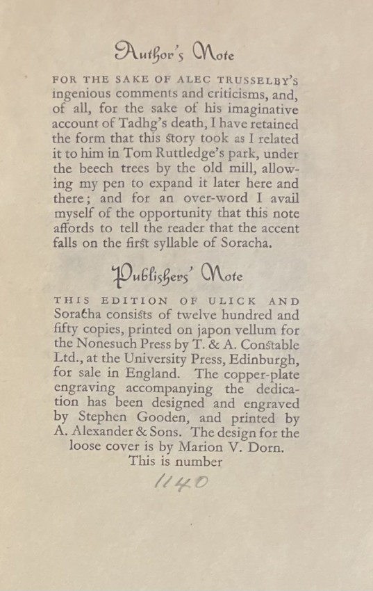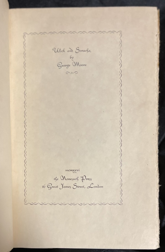 George MOORE. [NONESUCH PRESS:] Ulick and Soracha. London: [printed in Edinburgh by T & A Constable for ] the Nonesuch Press, 1926, original buckram, decorative dust-jacket after a design by Marion V. Dorn