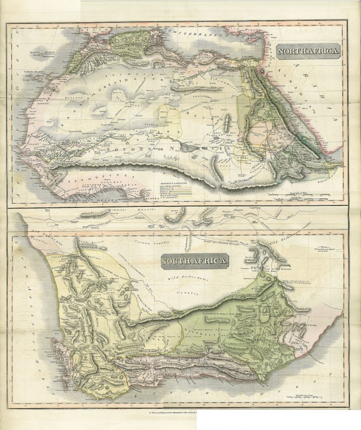 John Thomson’s unusual and well profuced map is two maps in one: North Africa and South Africa – the two areas of Africa that were reasonably well known to the British at that time. It is a wonderful snap shot from the British perspective of the two parts of Africa is know much better than other colonising nations.