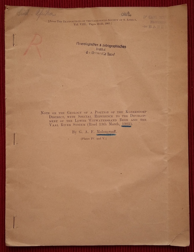 "Note on the geology of a portion of the Klerksdorf District, with special reference to the development of the Lower Witwatersrand Beds and the Vaal River system. [From the Transactions of the Geological Society of South Africa, Vol. VIII, Pages 16-25, 1905.]"; Paperback; 10 pages; Some usual yellowing, ex-owner stamps, top right corner little smudged, right side folded (circa 1,5 cm). Good condition overall.