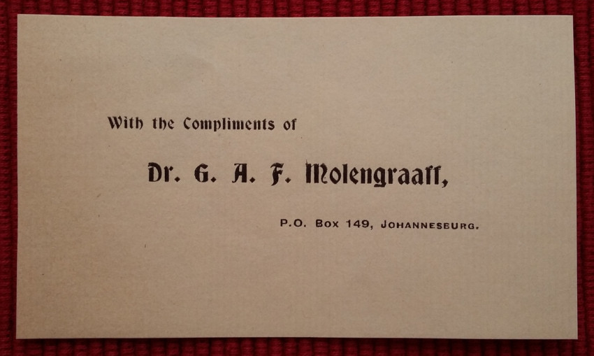 With paper visit card by the author ("With the compliments of Dr. G.A.F. Molungraaff, P.O. Box 149, Johannesburg").