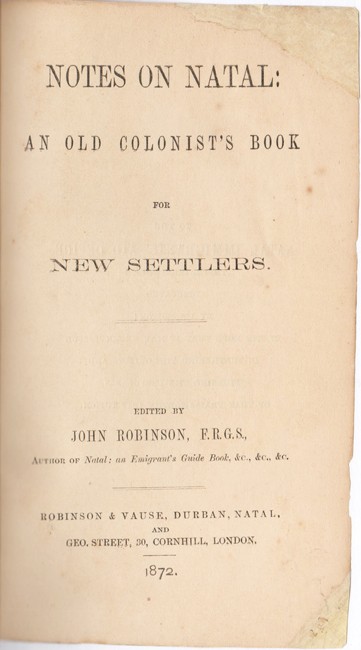 Mendelssohn (Sydney) South African Bibliography, volume 2, pages 236-7, ‘There is a full description of the estates and plantations of the colony, with much information respecting the individual farmers and their crops, and other interesting matter. A portion of the volume is devoted to an account of a trip to the then newly discovered diamond fields of Griqualand West. The writer reach Du Toit’s Pan on June 9, 1871, and he give an animated sketch of the scenes at the new digging. A letter from a digger written in December 1871 is reproduced; it is headed, “The great Camp at Colesberg Kop” and gives an early description of the Kimberley mine and the township. It is stated that some of the claims were valued at prices obtained for quarters of claims which would bring them up to £3000 for a full claim, while, “thousands of tents of all sizes and shapes are pitched around the kopje”.’