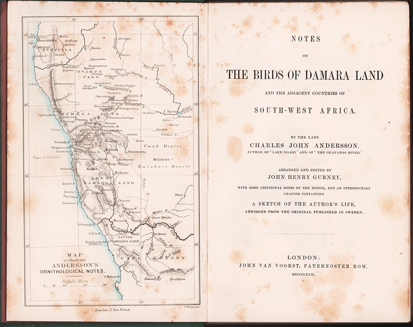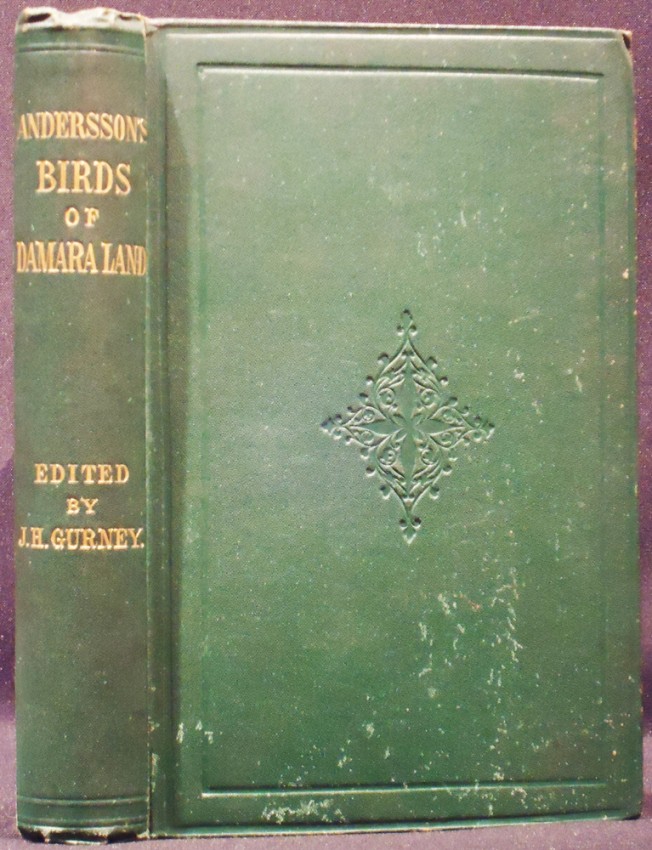 Mendelssohn (Sidney) South African Bibliography volume 1, page 42:. The biographical sketch is taken from a Swedish periodical called the Svenska Jagarforbundets nya Tidskrift, from which it was translated for the editor by Mr. L. Lloyd of Gothenburg, and it gives an interesting synopsis of Andersson's travels in South-Western Africa. Mr. Gurney states that 428 species of birds are enumerated in the volume, all of which have been observed either as residents, migrants, or accidental visitors in that part of South-Western Africa of which Damaraland is the central portion, but which also comprises Ovampo Land to the north, the districts adjacent to Lake Ngami to the north-east, a portion of the Kalahari desert to the south-east, Great and Little Namaqualand to the south, and the coast and adjacent isles of the Atlantic to the west. The work of identification of the species, with notes written on them by the traveller, was carried out with the assistance of eminent ornithologists, while a few well-known specimens, which Mr. Andersson did not meet with, have been included in the book, " for the purpose of making the entire catalogue of the birds known to inhabit these countries, as complete as possible." There is a map " to illustrate Andersson's ornithological notes."