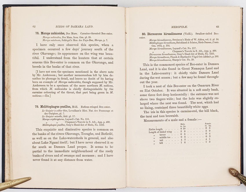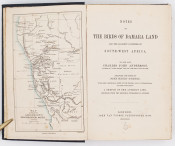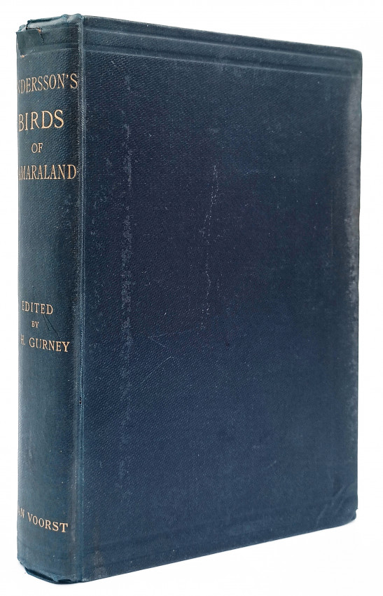 Mendelssohn (Sidney) South African Bibliography volume 1, page 42:. The biographical sketch is taken from a Swedish periodical called the Svenska Jagarforbundets nya Tidskrift, from which it was translated for the editor by Mr. L. Lloyd of Gothenburg, and it gives an interesting synopsis of Andersson's travels in South-Western Africa. Mr. Gurney states that 428 species of birds are enumerated in the volume, all of which have been observed either as residents, migrants, or accidental visitors in that part of South-Western Africa of which Damaraland is the central portion, but which also comprises Ovampo Land to the north, the districts adjacent to Lake Ngami to the north-east, a portion of the Kalahari desert to the south-east, Great and Little Namaqualand to the south, and the coast and adjacent isles of the Atlantic to the west. The work of identification of the species, with notes written on them by the traveller, was carried out with the assistance of eminent ornithologists, while a few well-known specimens, which Mr. Andersson did not meet with, have been included in the book, " for the purpose of making the entire catalogue of the birds known to inhabit these countries, as complete as possible." There is a map " to illustrate Andersson's ornithological notes."