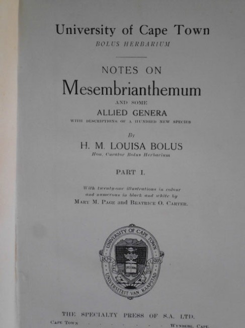 Seminal work on this succulent genus by renowned early botanist - an uncommon item. 156 pp with black & white photos and colour illustrations by Mary Page and Beatrice Carter. In linen-covered original boards, somewhat age-toned and scarred, but textblock in good, tight and clean condition. Ownership of botanist Doreen Court on endpapers, and the author's signed compliment slip laid down on endpapers. Subsequent parts 2 and 3 were published in 1935 and 1958. University of Cape Town