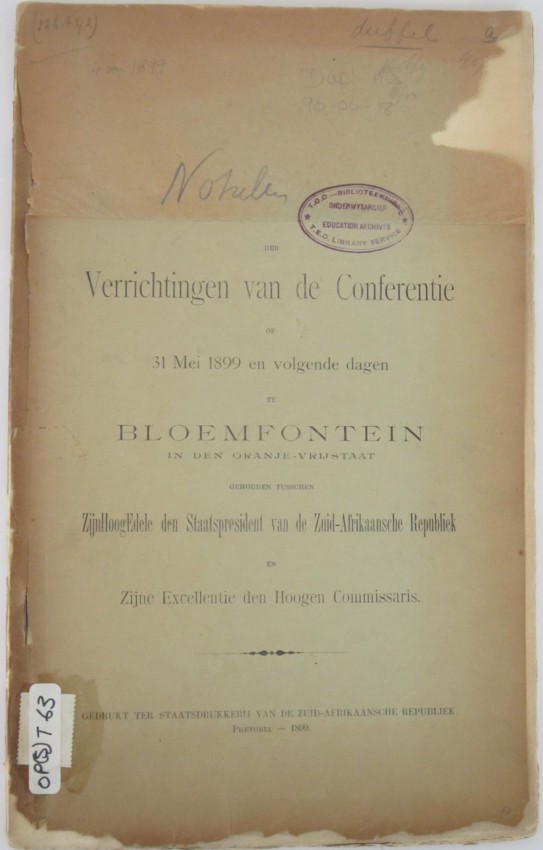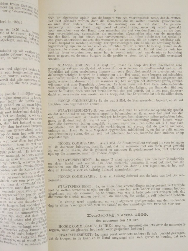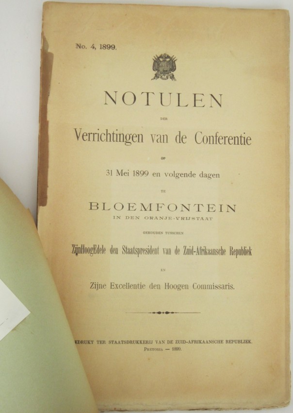 A most interesting record of the meetings between President Kruger and Lord Milner in Bloemfontein on 31 May 1899, only months before the outbreak of the second Anglo Boer War.