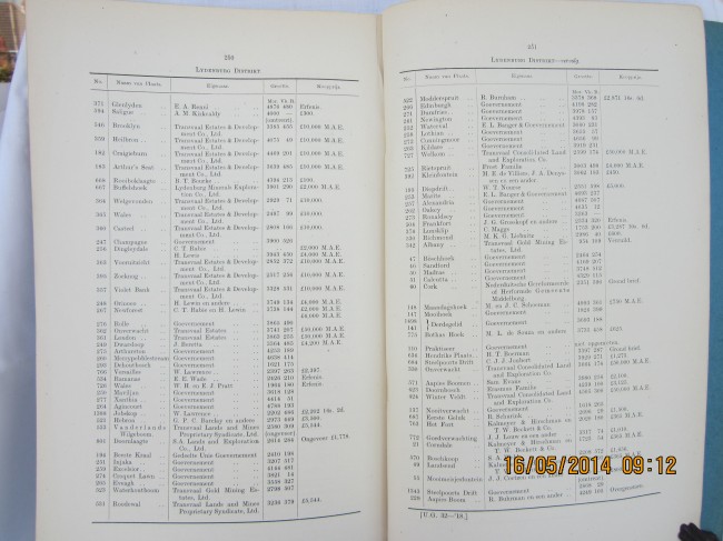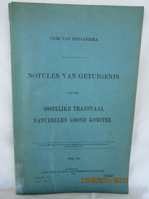 folio, 5+255 pages, index, tables (District by District statistics of Naam van Plaats, Eigenaar, Grootte, Koopprijs), Afrikaans text throughout : parliamentary "blue book", report of Land Committee; thin card covers, small repair to base of backstrip otherwise VERY GOOD CONDITION