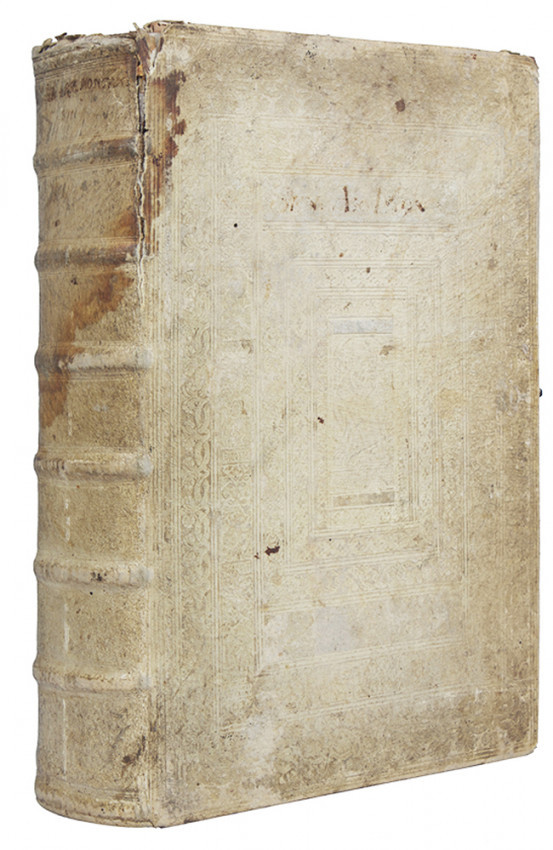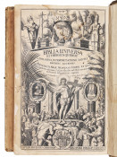 (24), 183, 283, 84, 203 pages. engraved title pages, some staining. Contemporary blind tooled vellum, soiled, stained and splitting at the top of the upper joint, clasp missing, a good copy.