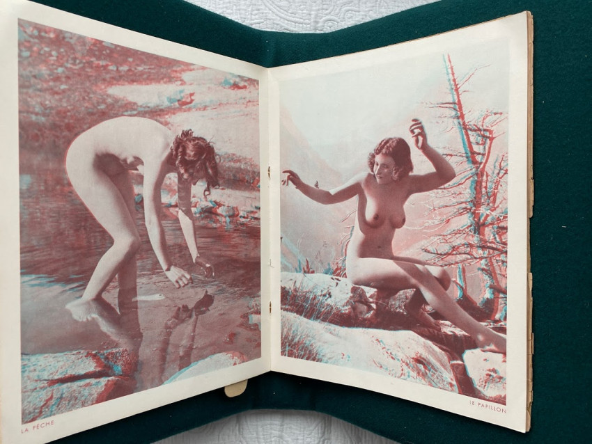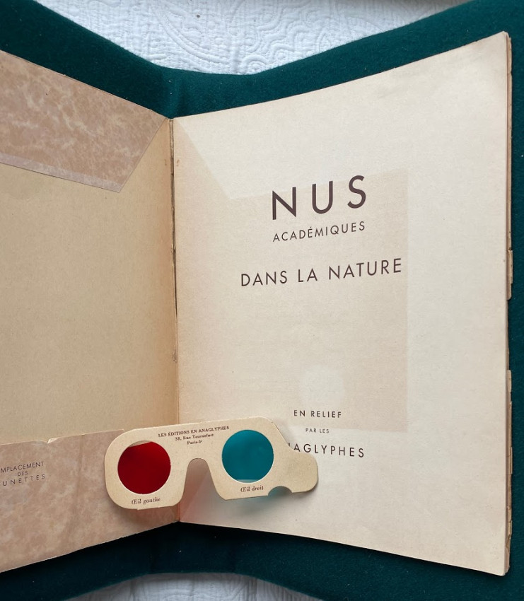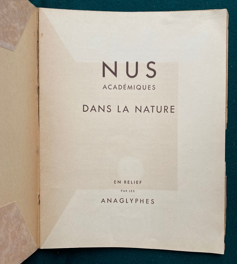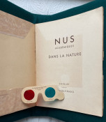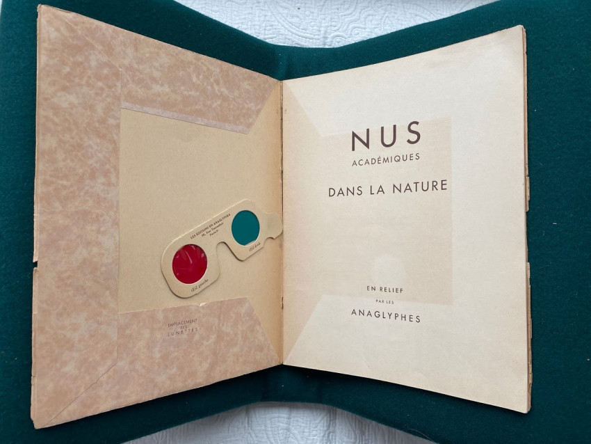 Nues Academiques dans la Nature [1.] en relief par les Analglyphes. [Paris: undated]. Quarto (12 1/2 x 9 3/4in; 318 x 247mm). Letterpress title and plate list. 17 'analglyphe' plates printed recto and verso of 8 leaves, together with the original loosely inserted 3-D glasses. Original wrappers, spine strengthened, edges chipped, contained within a custom-made green cloth clam shell box.