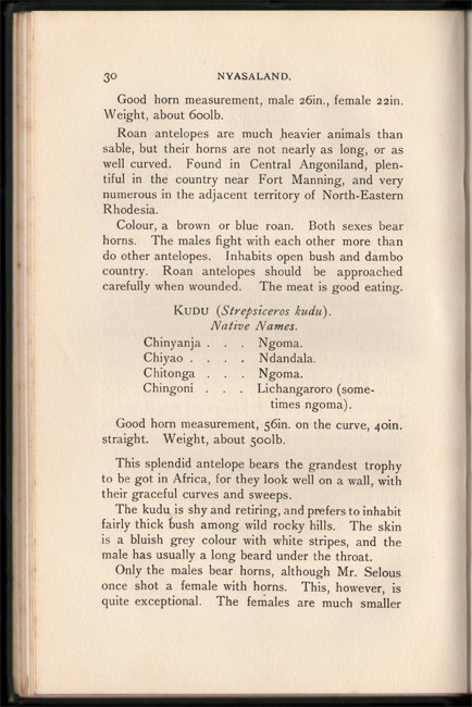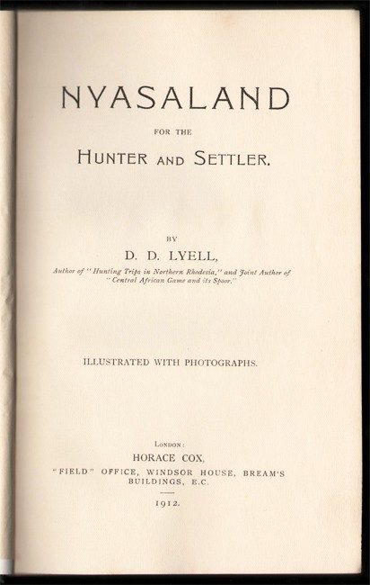 Czech: An annotated Bibliography of African Big Game hunting Books, 1785 to 1999, page 173, β While not a book of hunting adventures, this slender work does provide plenty of information on choosing big-game rifle as well as the varieties of game encountered in Nyasaland. Several of the plates depict the spoor of wild beasts, a theme Lyell continued in later works. As he notes: βTo spoor an animal for miles is far more interesting than killing it, for tracking game is the highest branch of good hunting.β Of additional interest are the ads at the end of the book depicting all manner of British sporting firearms, ammunition, and equipment.β