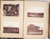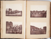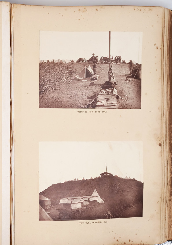 154 photographs mounted on 41 stiff card leaves, original half black leather with patterned dark green cloth sides, titled gilt on upper cover, back untitled but decorated with gilt bands, all edges gilt, the binding is lose with a simple repair to the front free endpaper, the leather is worn at the top and bottom of the spine and at the corners, portion of the cloth over the rear board is missing, the leaves are mounted on linen hinges, foxing on the card leaves but the photographs are clean and clear, the photographs are half plate in size (150 x 200 with some variation) and 5 are panoramas comprising two half plates joined together, each photograph has a short printed caption beneath it.