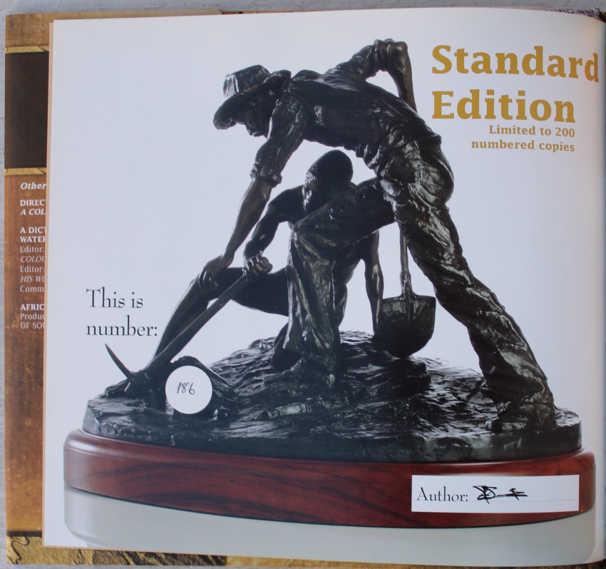 Inspired by the sculptures of miners by Tienie Pritchard. Numbered 186 of the standard edition limited to 200 numbered copies. Signed. Pictorial hard cover with the dust jacket and 323 pages in fine condition.