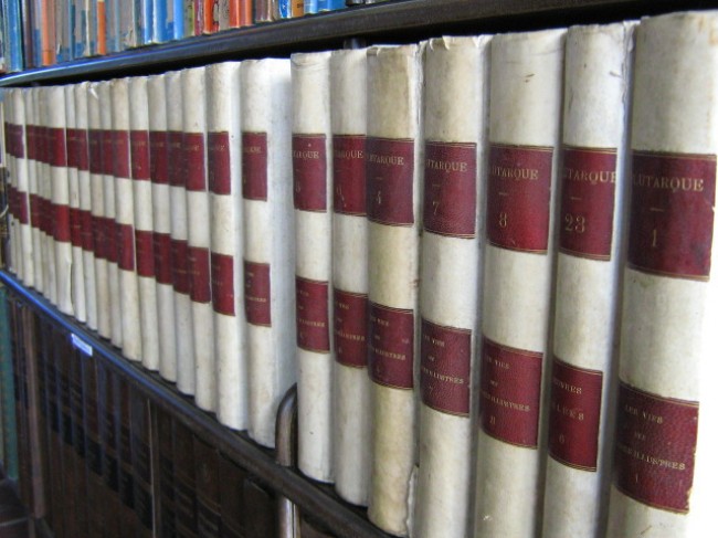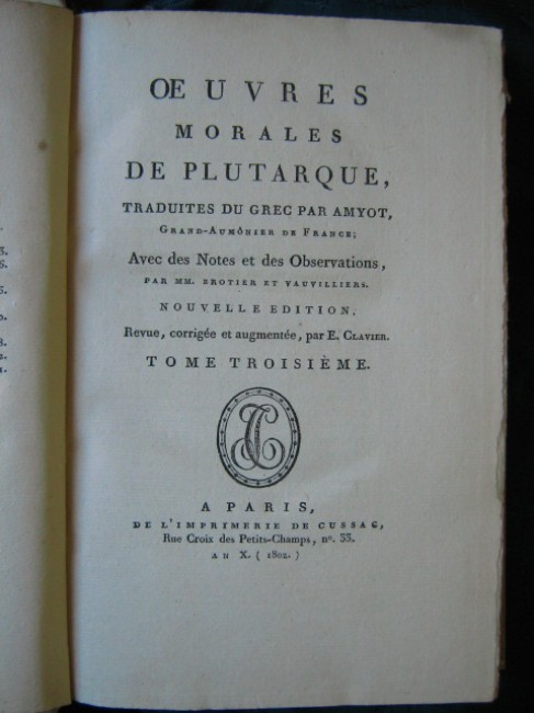 Plutarch\'s biographies of famous Greek and Roman statesmen, emperors and philosophers, such as Marcus Aurelius, Fabius Maximus, Demetrius, Marcus Antoninus, Tullus Hostilius, Alexander, Gelon, Jason, Cyrus, Demosthenes, Aristomene, the society of Athens, etc...and is a truly remarkable library of information on these great historical figures, in very good condition for its age.