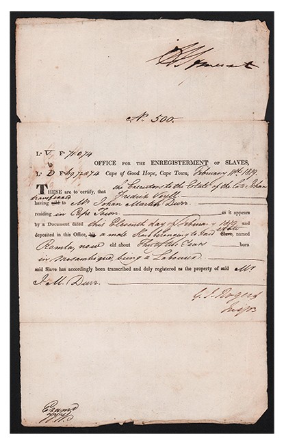 Single leaf, printed on one side and completed in black ink, lightly embossed VOC stamp in top right hand corner. The slave's name is written on the verso of this leaf.