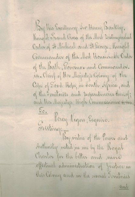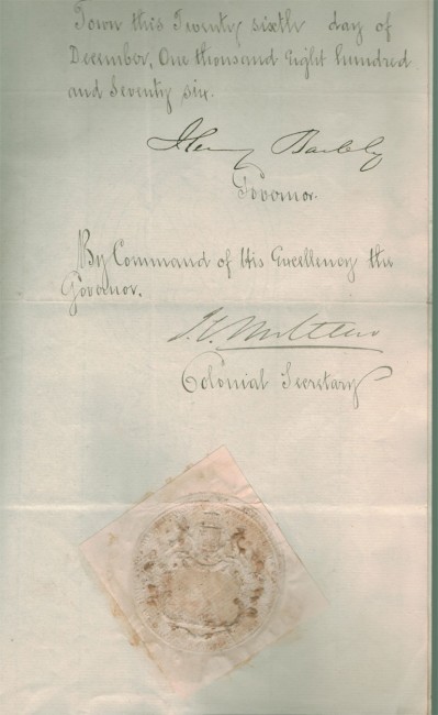 Official Document Signed by Barkly and the Colonial Secretary, Cape Town, 26th., December, 1876, re-appointing Percy Vigors as High Sheriff of Cape Colony until January 1878; with a covering official letter from the the Colonial Secretary\'s Office. 29th. Decemb. 1876