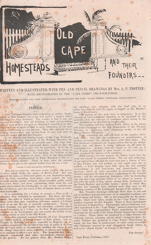 Dictionary of South African Biography, volume V, pages 782-3. Old Cape Homesteads and their founders is Mrs Trotter's pioneering work on Cape Dutch architecture. It precedes Old Colonial houses of the Cape of Good Hope published in 1900. Alys Fane Trotter (1863 - 1961) lived at the Cape between 1896 and 1898. She cycled throughout the Cape Peninsula and vicinity taking voluminous notes of the old Dutch houses sketching many of them and making accurate and attractive drawings of their construction and embellishment. In 1898 she was invited by the "Cape Times" to write an illustrated history of the old Cape Dutch houses; this was published as the "Cape Times" Christmas number of that year, produced with the assistance of H.C.V. Leibbrandt, keeper of the Cape Archives.'