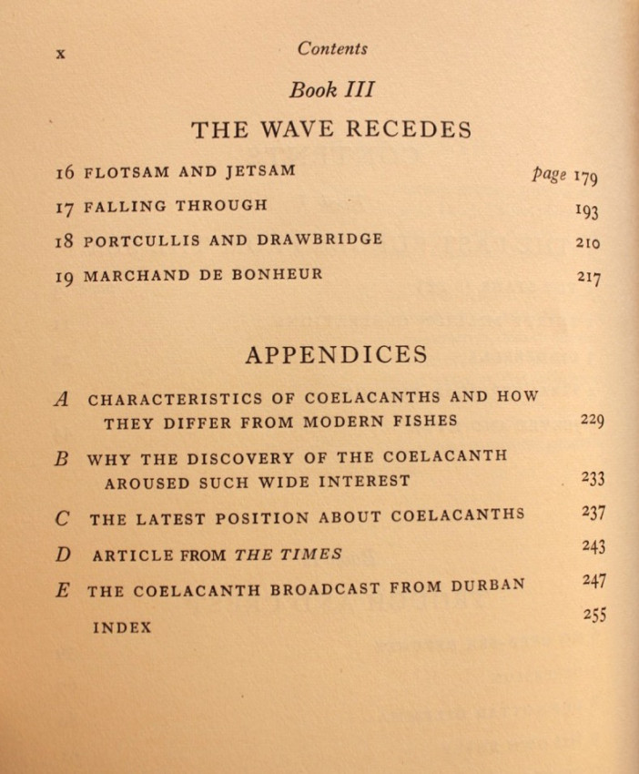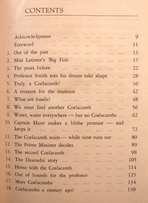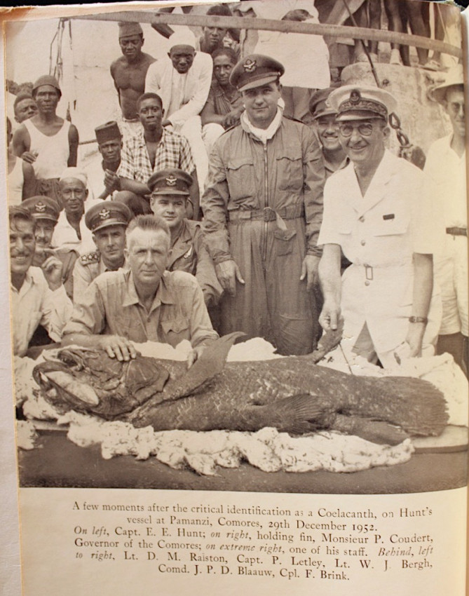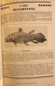 This discovery caused the greatest sensation, and as all parts of so ancient a type are of great scientific interest, it became imperative to find more specimens. Professor Smith deduced that this Coelacanth must have been a stray, whose true home probably lay somewhere in the reefs of the wild seas along East Africa. Alone in this view, indeed against the opinions of almost all other scientists, he and his wife carried out a series of arduous expeditions covering most of the wildset parts of the tropical western Indian Ocean, excepting French waters. Thousands of leaflets in English, French and Portuguese, giving a picture of the Coelacanth and offering a reward were sent to all parts including French possessions. This long lonely search over no less than fourteen years ultimately achieved success, the thrilling climax involving South Africa's Prime Minister and a dramatic flight in a military plane from South Africa to a little known island in the remote Comoro archipelago, now definitely established as the home of this living fossil.'