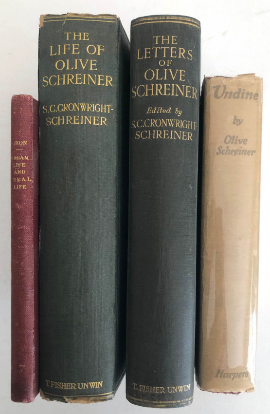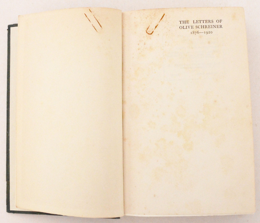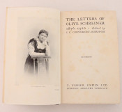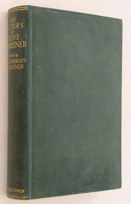 3. The Letters of Olive Schreiner. 1924. Edited by S.C. Cronwright Schreiner. T. Fisher Unwin. 8vo. Rebacked in the original green cloth with the original spine laid down and with new endpapers. Some light foxing of the prelims and two rusted paper clip marks on the half-title and the opposing page. Otherwise a very clean tight copy.