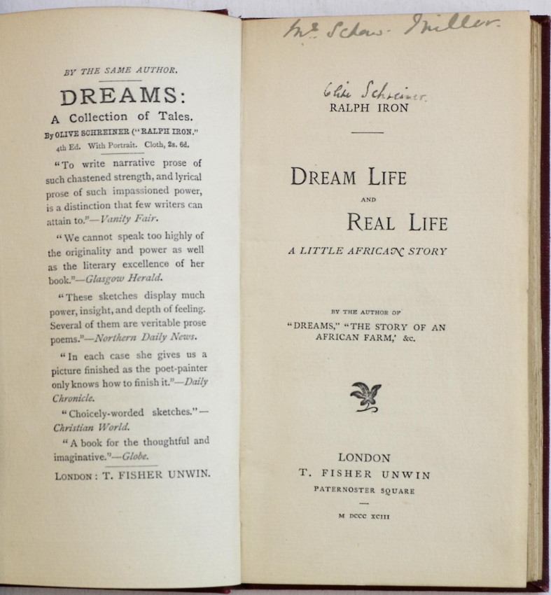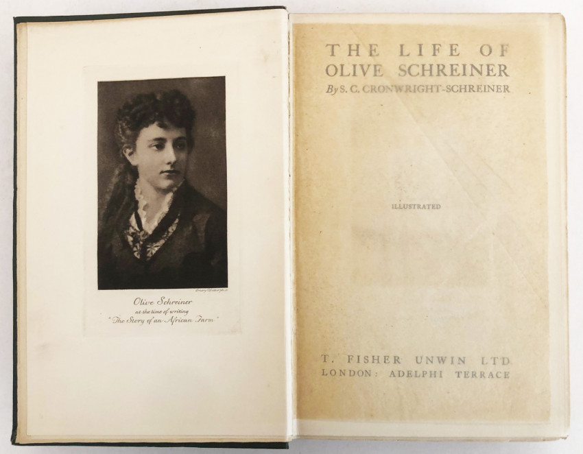 2. The Life of Olive Schreiner. By S.C. Cronwright Schreiner. 1924. T. Fisher Unwin. 8vo. In the original green cloth. Rear joint starting to crack but still firm. Internally very good. Ex libris the prestigious Hosken library with their bookplate on the front pastedown.