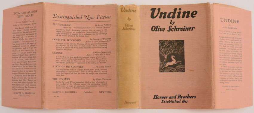 4. Undine. 1928. Harper and Brothers. 8vo. 1st. US edition. In the original maroon cloth backed green cloth with patterned pink endpapers in the original dustwrapper. A very good copy in dustwrapper which has some age wear and light chipping at the extremes of the spine which is also a touch sunned.