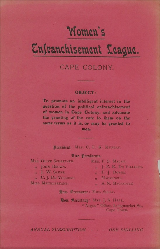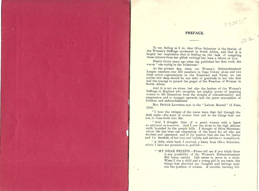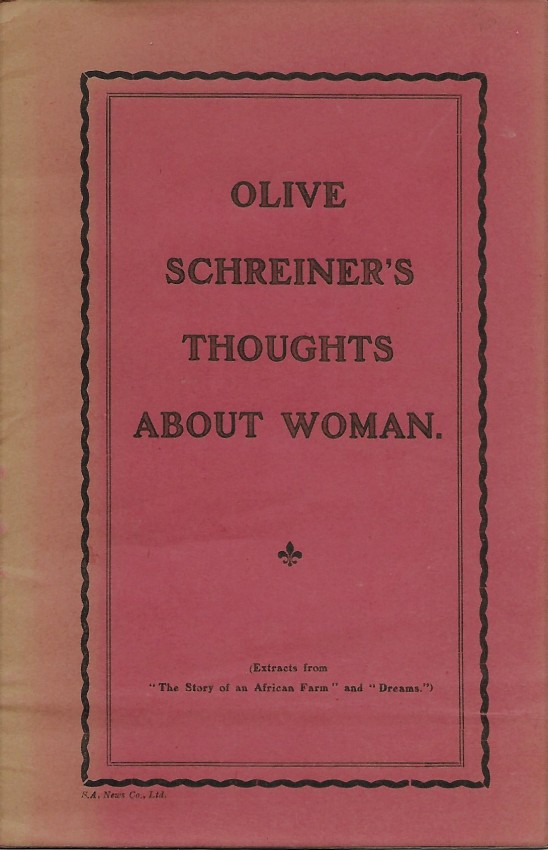 A very scarce 15pp. pamphlet in the original printed red stapled wraps. Containing extracts from The Story of an African Farm and Dreams with a 3pp. Introduction by her close friend Anna Purcell. Published by the Cape Women's Enfranchisement League of which Schreiner was a "Vice-President" (see image of rear wrapper). In the foreword, Purcell extols Schreiner's importance in the Woman's Suffrage Movement, particularly in South Africa. In the event, women did not get the vote in South Africa until 1930. This pamphlet precedes Schreiner's major work, Women and Labour, by 2 years. SABIB Vol. 4, Page 165 (8 copies).