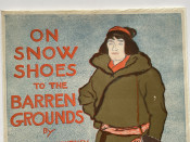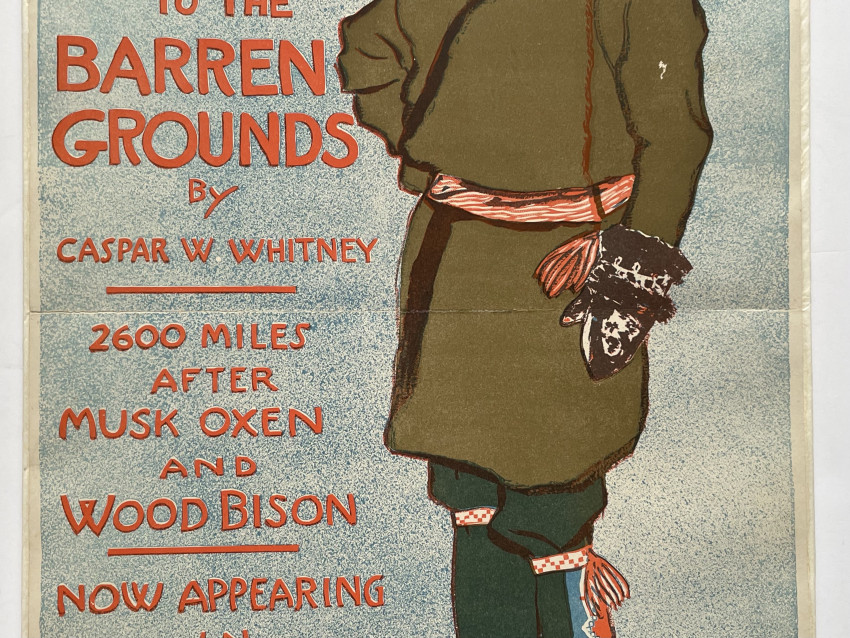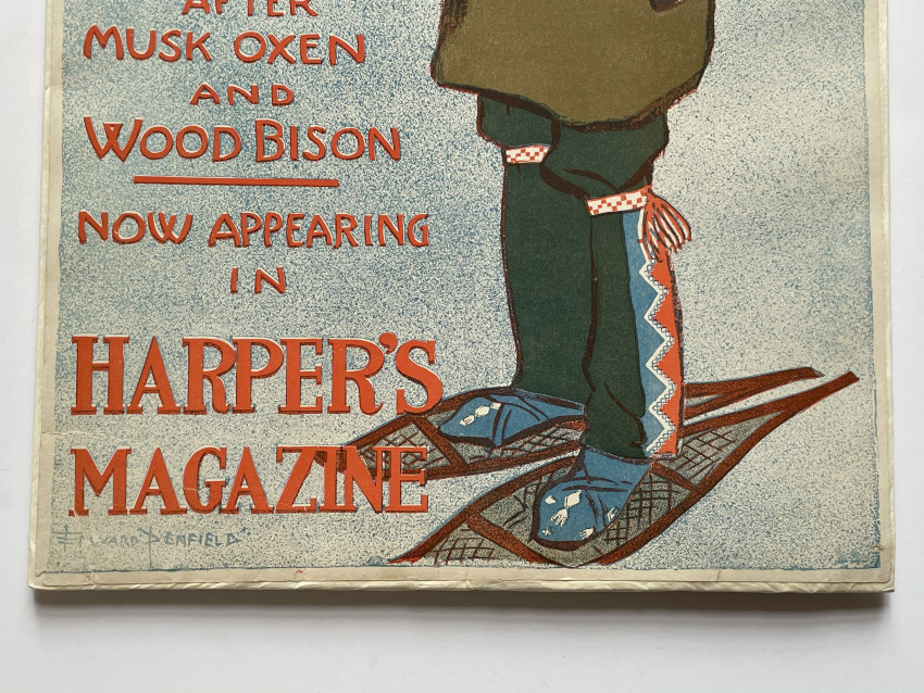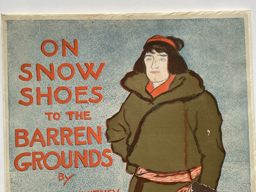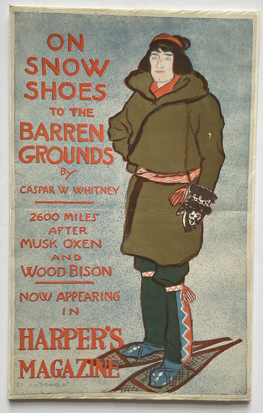 Harpers Magazine advertising poster for Caspar WHITNEY’s book showing a man, dressed in moccasins and beaded leggings, belted coat and mittens, wearing snowshoes.