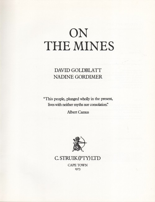 Nadine Gordimer has contributed an introductory essay, 'She describes an extraordinary scene now fast disappearing. She writes at first hand of the mining community, where black men put gold and power into the hands of white men.' 'This book is an essay in the understanding of men and the style, grace and significance which inhabits their most mundane activities.' Editor's note.