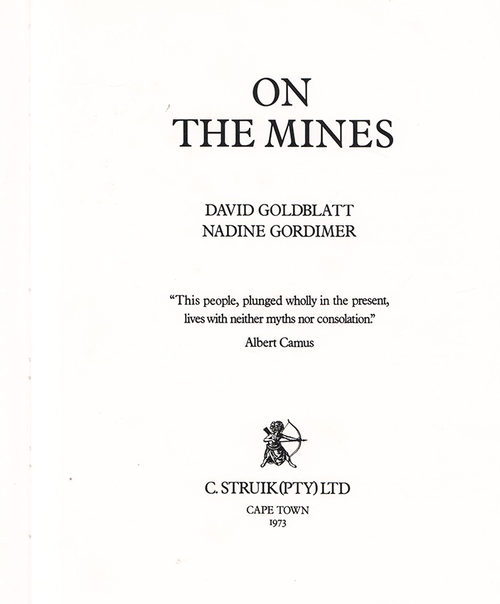 Editor's note. Nadine Gordimer has contributed an introductory essay, 'She describes an extraordinary scene now fast disappearing. She writes at first hand of the mining community, where black men put gold and power into the hands of white men.' 'This book is an essay in the understanding of men and the style, grace and significance which inhabits their most mundane activities.'