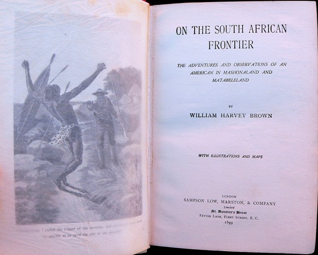 "This book is a narrative of the author's experiences and observations, partly as naturalist of an expedition sent by the U.S. Government in 1899 to the west coast of Africa, but mainly as collector, big game hunter, gold seeker, landowner, citizen, and soldier during seven years' participation in the settlement and early development of Rhodesia. " (Preface) Brown joined Cecil Rhodes' pioneer expedition to Matabeleland in 1891, and fought in the Matabele and Mashona uprisings. His sporting adventures included hunting for antelope, hippopotamus, rhinoceros, buffalo, and lion. Inserted at the front is a facsimile letter from Cecil Rhodes attesting to the truthfulness of Brown's narrative. Mendelssohn I p. 308. Czech p. 24. Hosken p. 28. cfSmith B142.