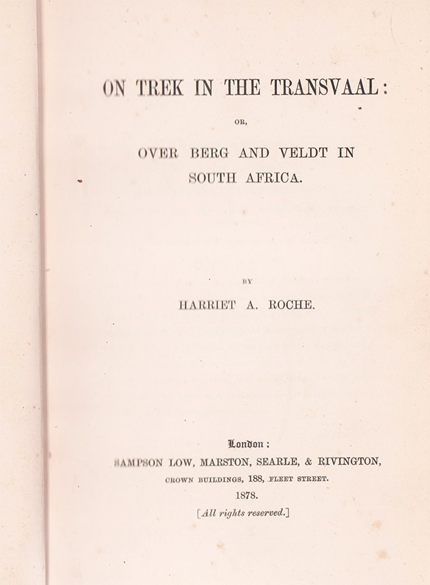 Harriet's book, On Trek in the Transvaal; or, Over Berg and Veldt in South Africa was published in London by Sampson Low, Marston, Searle &. Rivington, in 1878. https://en.wikipedia.org/wiki/Harriet_A._Roche