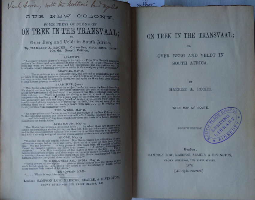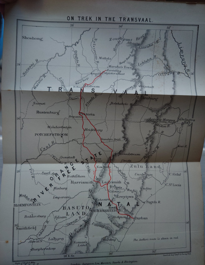 The author's account of a wagon journey from Pietermaritzburg through Orange Free State & the Transvaal 1875-6, Mendelssohn II.239 "pleasantly written . . a good description of the domestic life of the Boers"
