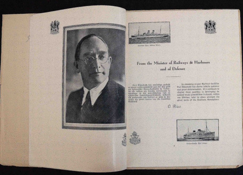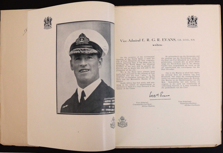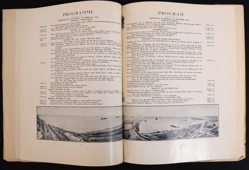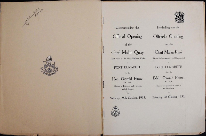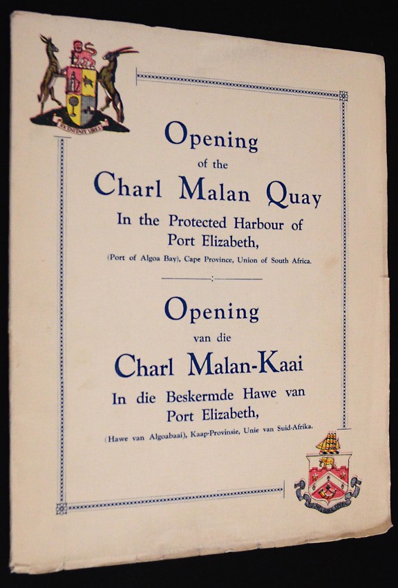 A near fine copy of this scarce 32pp. brochure to open the new Charl Malan Quay in Port Elizabeth. In the original slightly oversized wraps with consequent slight fraying of the edges. The booklet has been protected by the original tissue dustwrapper which is still present albeit somewhat frayed.