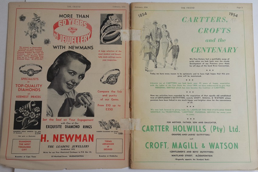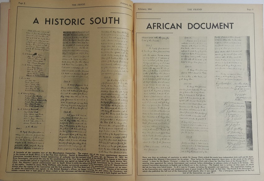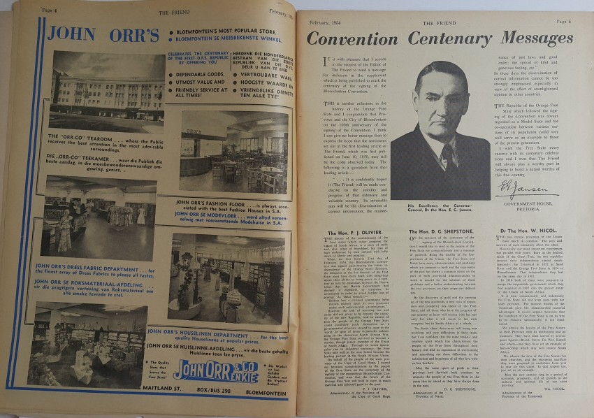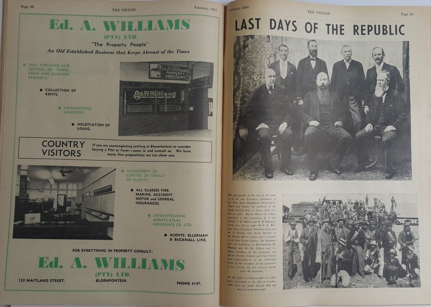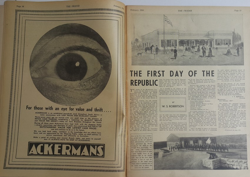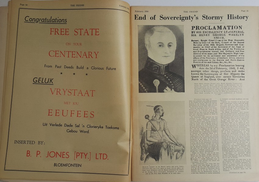 The subtitle says it all. The text is in good condition. The spine of the wrapper is splitting. Wrapper secured with tape. Marginal tear, (2 cm), page 3. Many photographs and a comprehensive summary of Free State history in the century. A most interesting supplement of 112 pages.