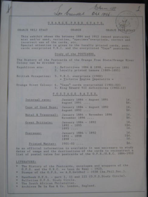 \"Catalogue of an exhibition of postcards issued between 1884 and 1912, mint and/or used, varieties, \'specimen\' overprints, correct and incorrect use of the cards, etc. Special attention is given to the locally printed cards, postcards overprinted V R I and the overprinted \'Cape\' postcards.\"
