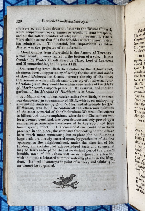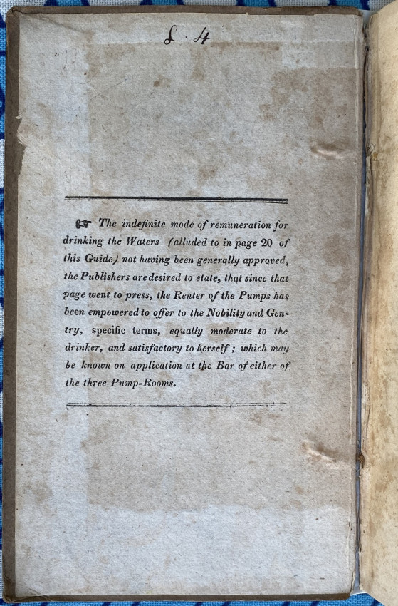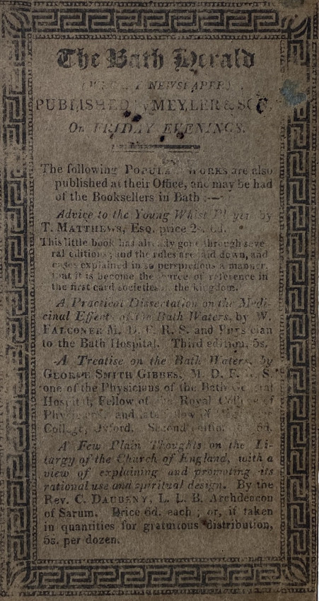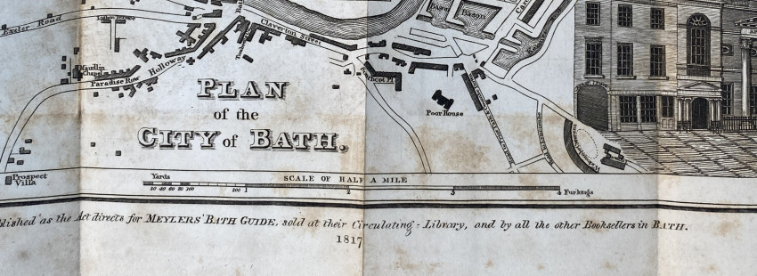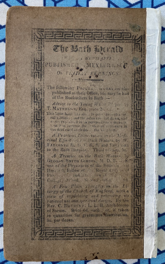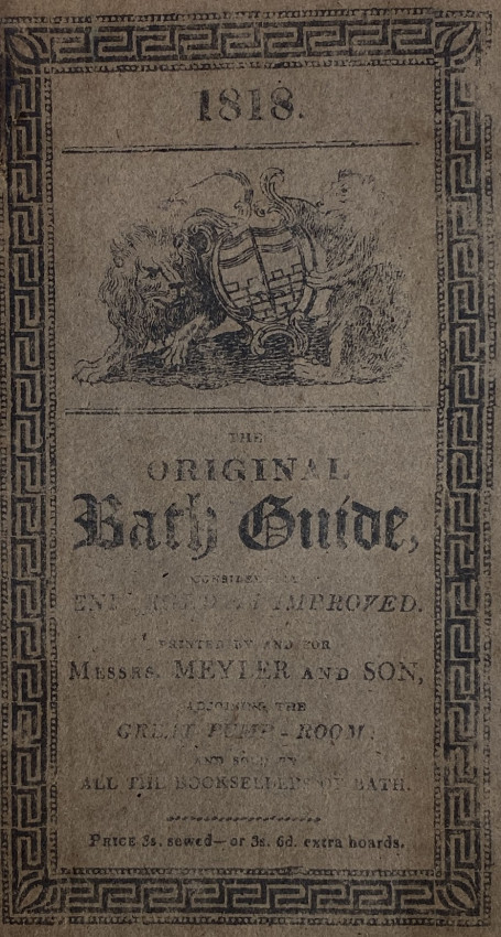 Bath: printed by and for Meyler and Son, adjoining the Pump-room, [undated but 1817-1818], 12mo signed in 6s (6 7/8 x 4 1/8 inches; 174 x 104mm). Pp. [1-]4-138, 2 folding engraved maps [one dated 1817], 2 engraved plates [one folding], 1 full-page illustration. (Light overall toning). Original printed boards, ‘1818’ date on the upper cover, letterpress note about charges for ‘drinking the Waters’ printed on the front pastedown (rebacked with vellum).