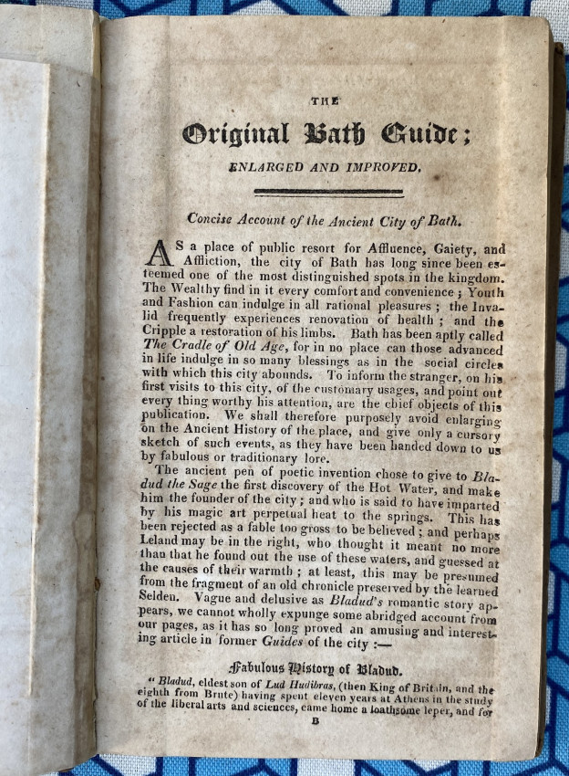 The Original Bath Guide, considerably enlarged and improved; forming an indispensible pocket companion for the visitor and inhabitant. Included in this work are An Essay on the Efficacy of the Bath Waters … A Description of Ancient and Modern Bath… and a variety of miscellaneous information.