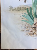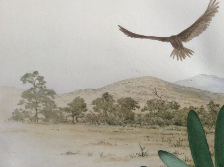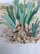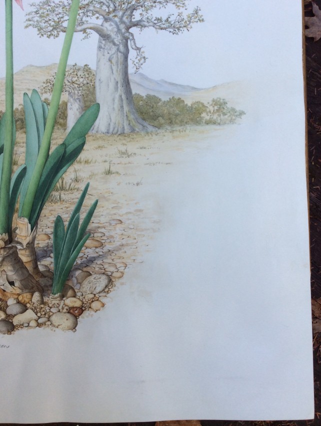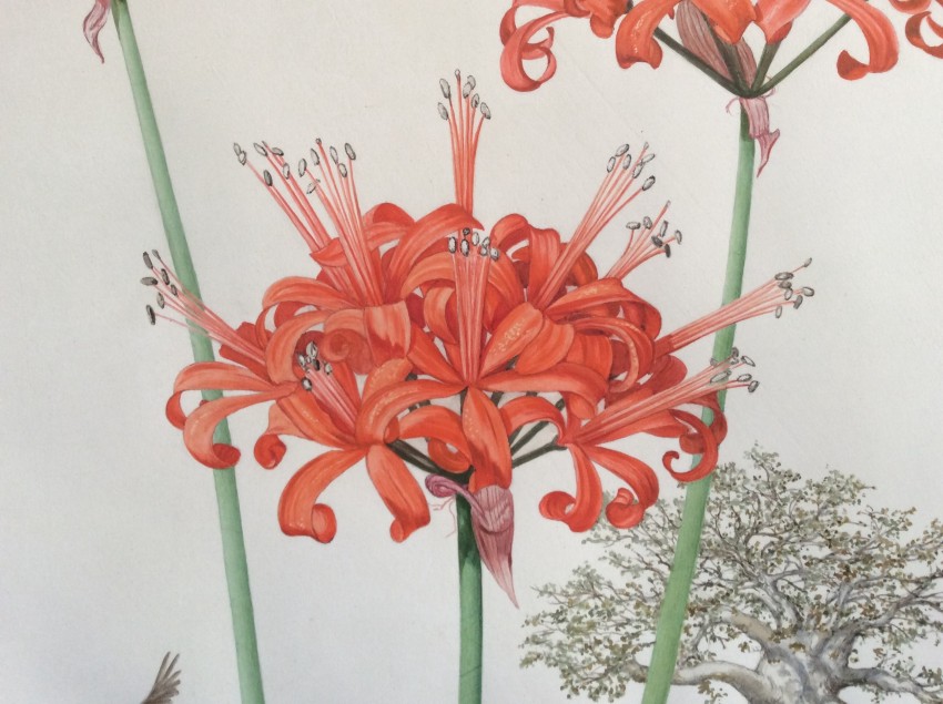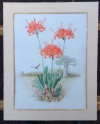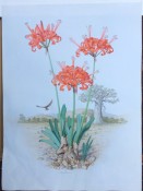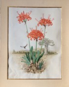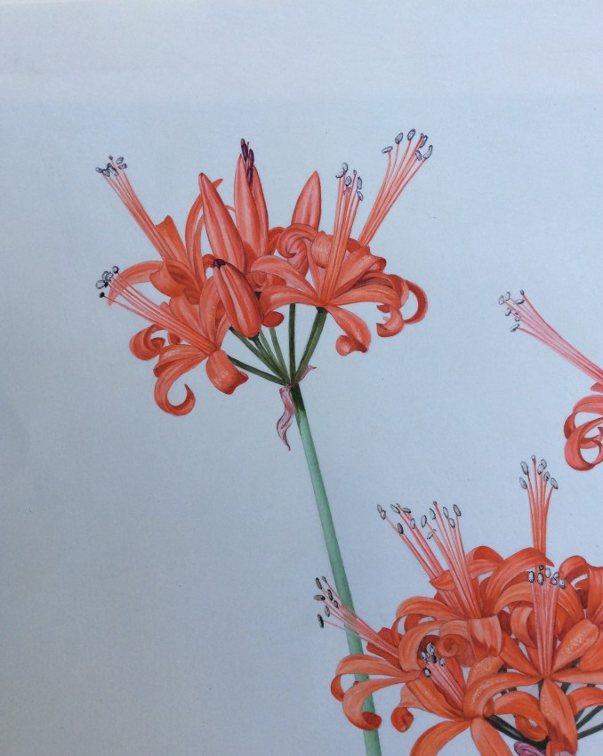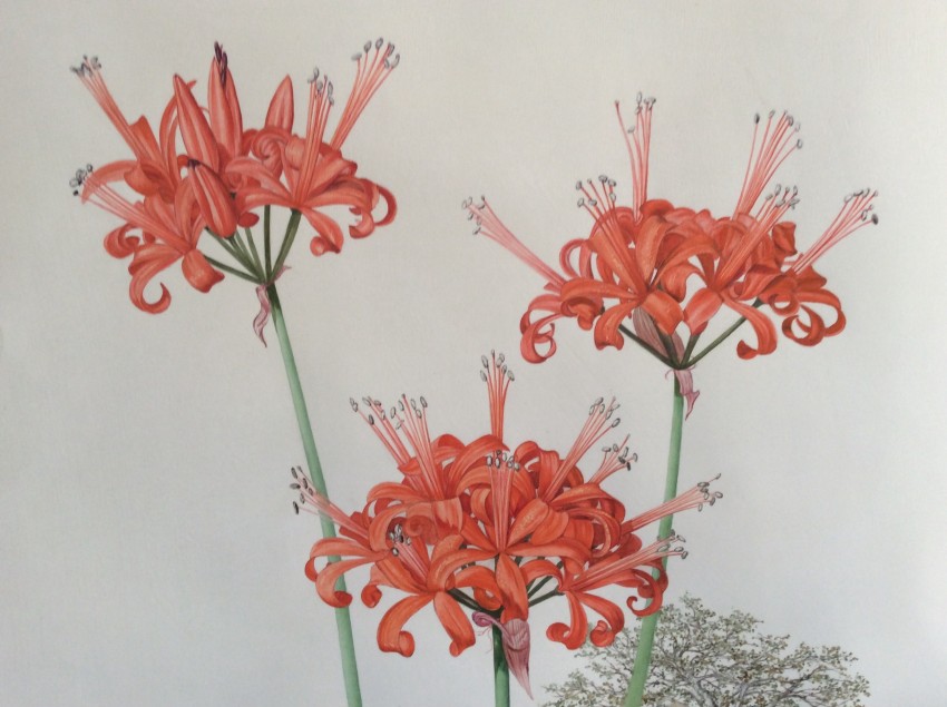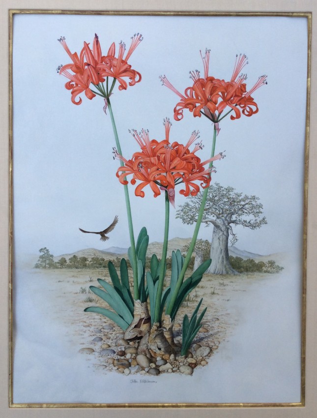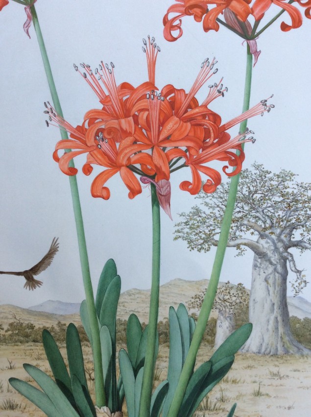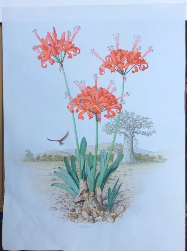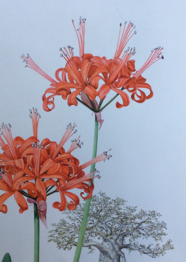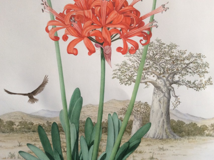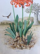 Botanical portrait on vellum of a small group of orange-flowered Nerine, in a South African landscape.