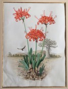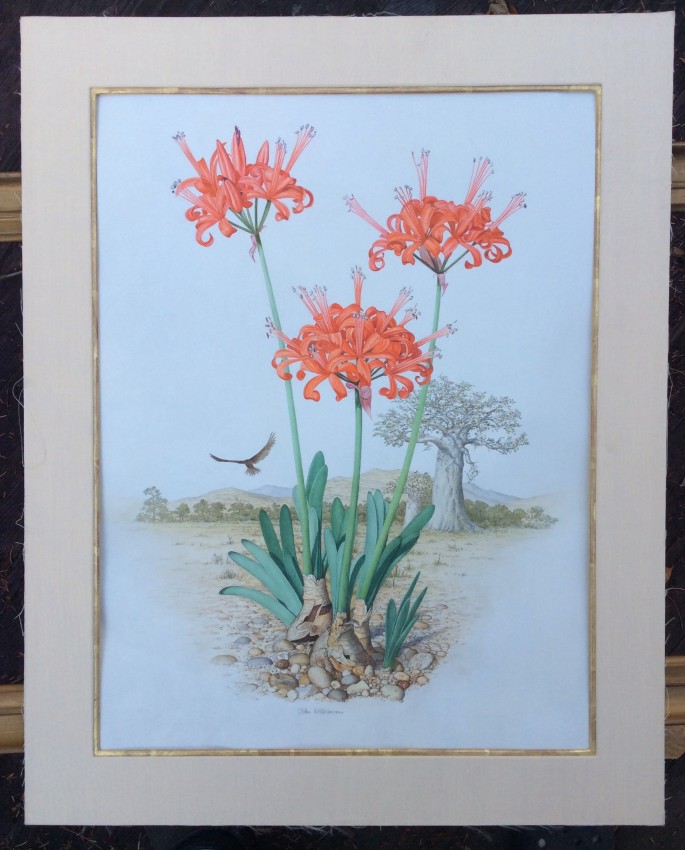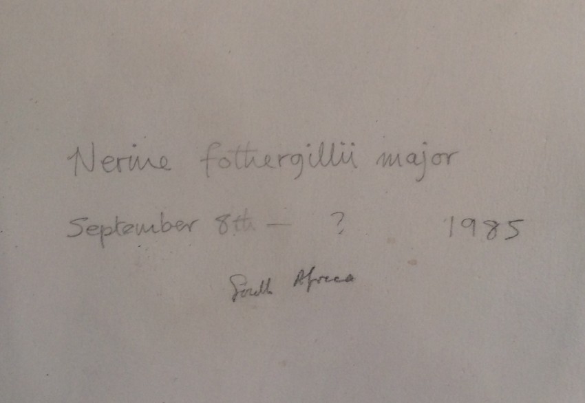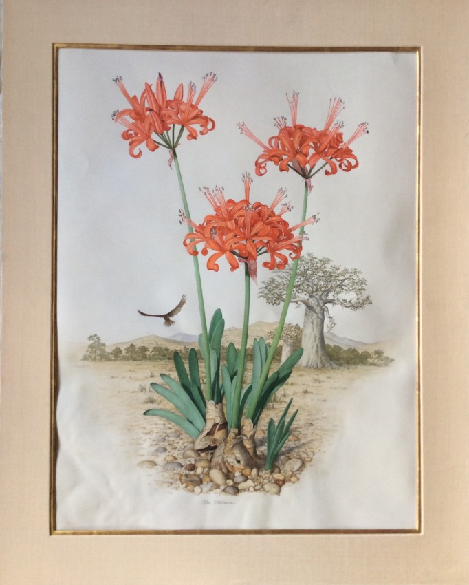 An original watercolour and gouache drawing on vellum, signed by the artist, and inscribed in pencil on the verso "Nerine fothergillii major /September 8th - ? 1985 / South Africa", sheet size: 21 3/4 x 16 3/8 inches. Custom cloth-faced matt with gilt slip