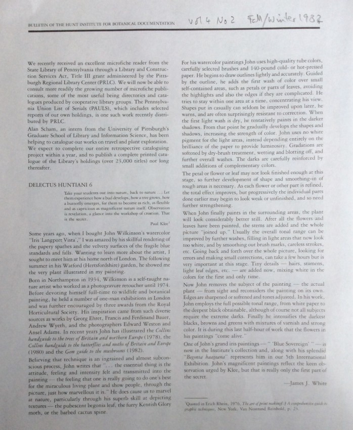 The Hunt Institute has featured Wilkinson's work regularly (see http://www.huntbotanical.org/search/?q=john%20wilkinson). Most notably they mounted an exhibition between 13 April and 14 July 1995, titled: "Botanical Watercolors by British Artists Andrew P. Brown and John Wilkinson".