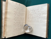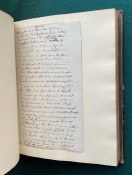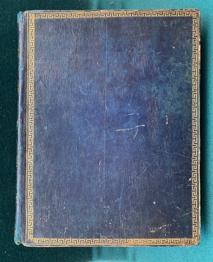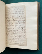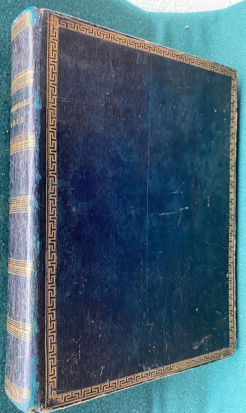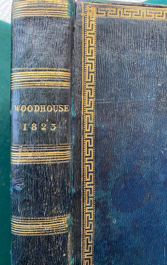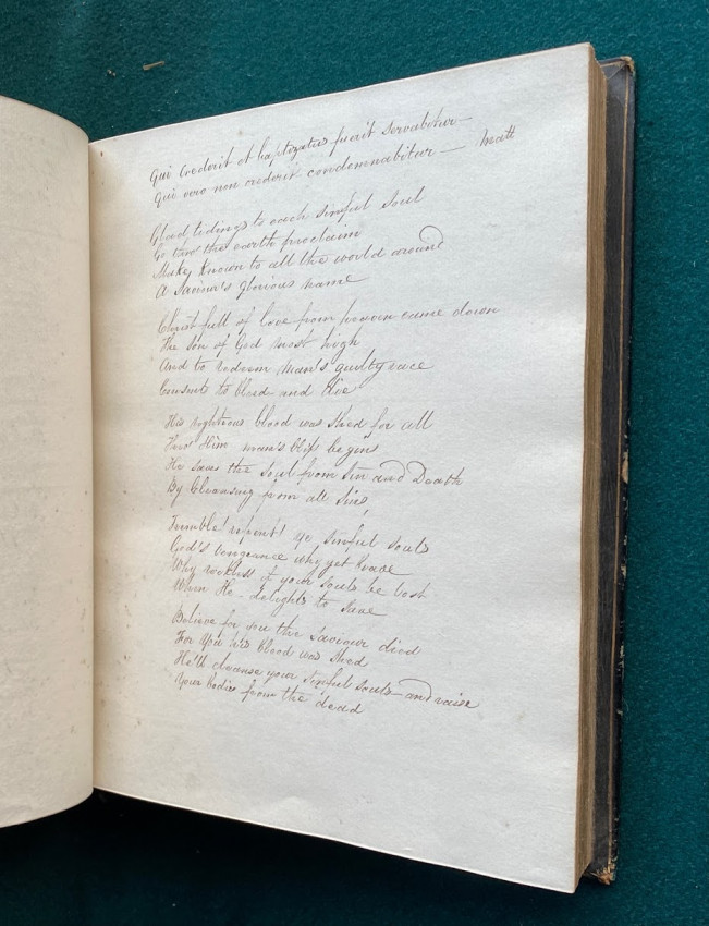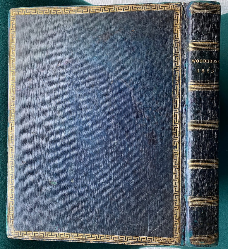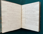 [United Kingdom: July 1823 - April 1842]. Quarto (8 3/8 x 7 1/4in; 213 x 184mm). 57pp. of manuscript poetry, comprising 21 different poems, ranging in length from 8 lines, to 24 pages. Extra-illustrated with 10 pagesof loosely inserted verse (apparently by the same hand). Approx.107 laeves of blank paper complete the album. Blue straigt-grained morocco, covers bordered in gilt, the fllat spine divided into six compartments by gilt rules and roll tools, lettered in gilt in the second compartment 'Woodhouse / 1823', marbled endpapers, gilt edges (some scuffing to extremities (see images).