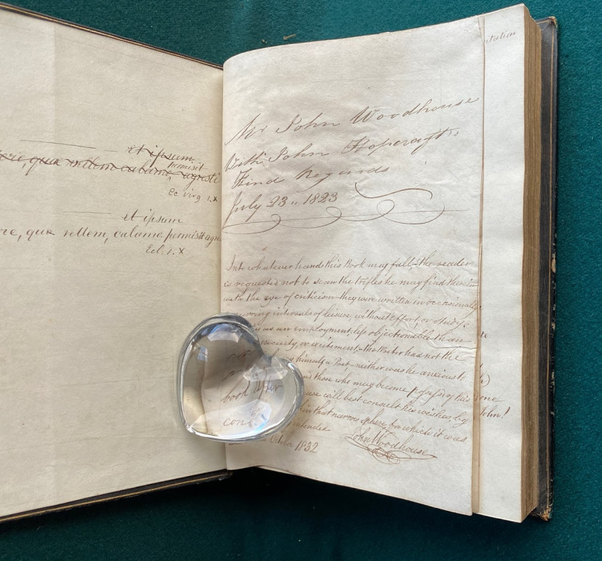An album containing 57pp. of autograph manuscript poetry, preceeded by a page with a presentation inscription 'Mr John Woodhouse / With John H\opcraft's / Kind Regards / July 23 1823' followed by a 12-line 'apology' by Wodehouse, signed and dated 'London October 1832'.