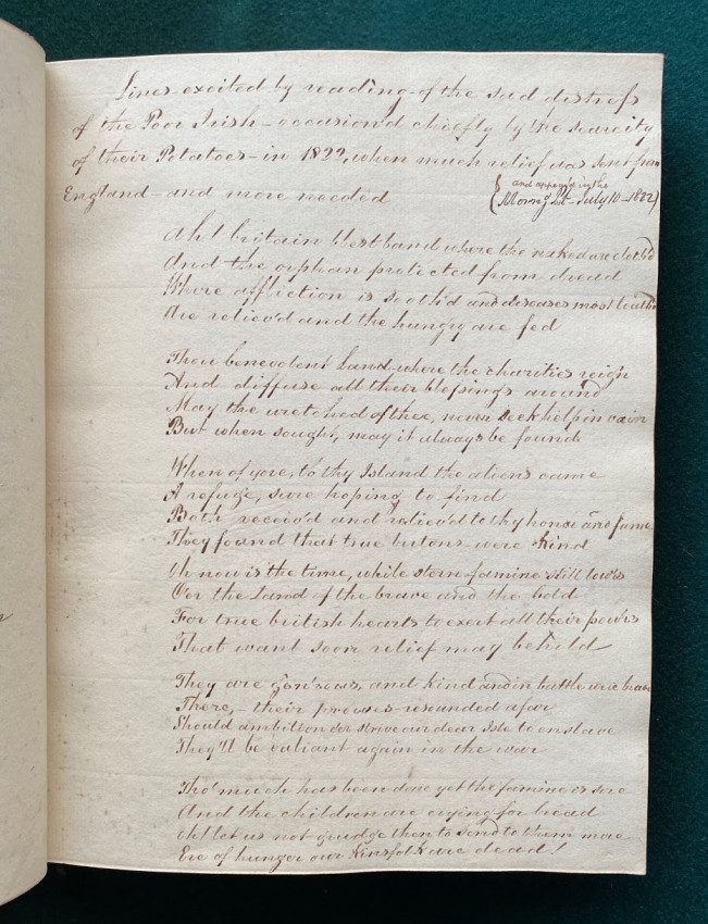 A attractive collection of manuscript poems: one on the Irish Famine in 1822.