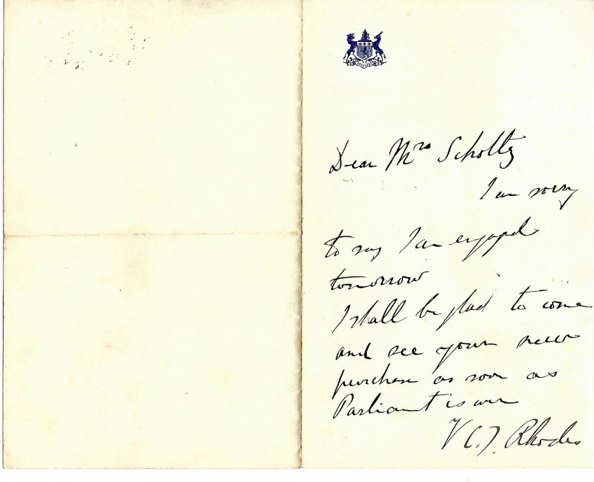 A one page undated autograph letter to a Mrs. Scholtz from Cecil John Rhodes. Circa 30 words. Regretting he is "engaged tomorrow" but offering to see her "new purchase as soon as Parliament is over". Written on the obverse of a single folded sheet with an official (probably Cape) letterhead and presumably written when he was Prime Minister of the Cape Colony between 1890 and 1896. In very good condition.