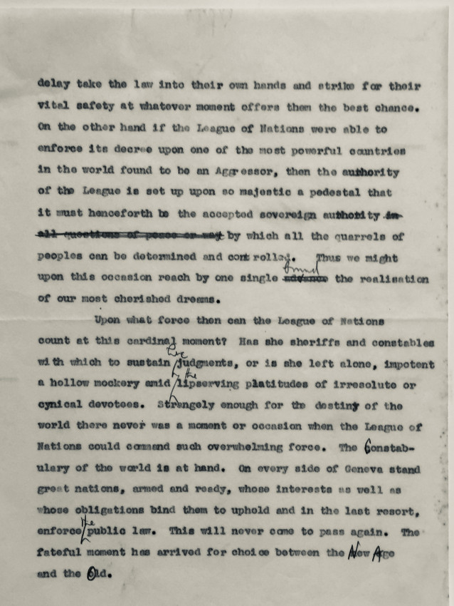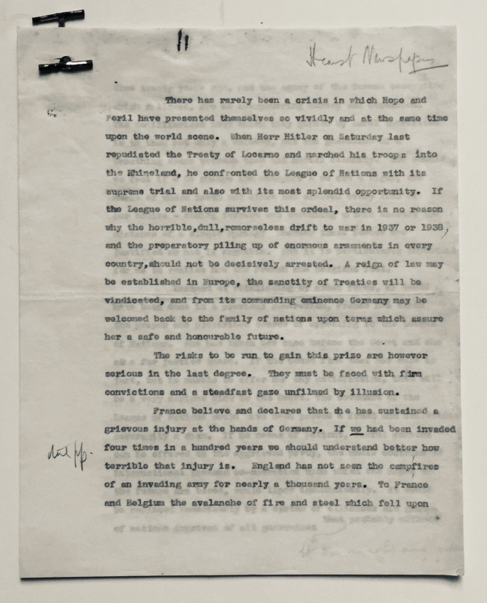 Original carbon-copy typescript of an article, starting "There has rarely been a crisis in which Hope and Peril... , with manuscript corrections. [No place: undated but March 1936]. 5 pp. article with ms corrections, punch hole with treasury tag at top left corner, "Hearst Newspapers" in pencil in top right corner of first leaf.