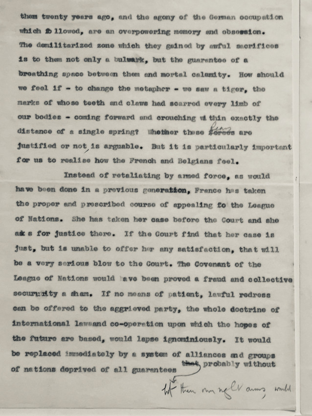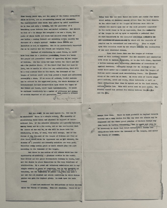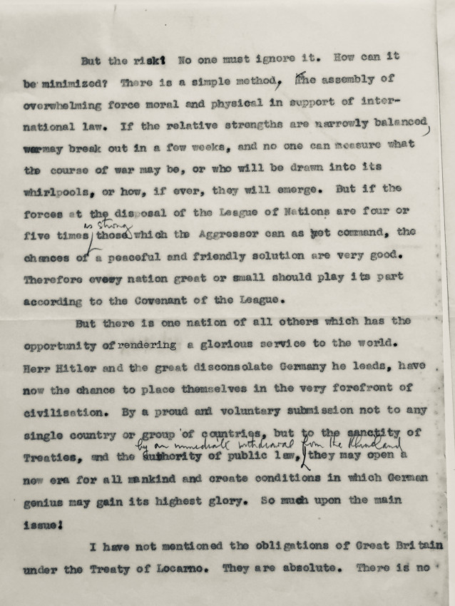 “There has rarely been a crisis in which Hope and Peril have presented themselves so vividly and at the same tine upon the world scene. When Herr Hitler on Saturday last repudiated the Treaty of Locarno and marched his troops into the Rhineland, he confronted the League of Nations with its supreme trial and also with its most splendid opportunity. If the League of Nations survives this ordeal, there is no reason why the horrible, dull, remorseless drift to war in 1937 or 1938, and the preparatory piling up of enormous armaments in every country, should not be decisively arrested. A reign of law may be established in Europe, the sanctity of Treaties will be vindicated, and from its commending eminence Germany may be welcomed back to the family of nations upon terms which ensures her a safe and honorable future.”